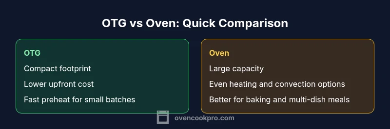An OTG is a compact countertop unit with basic functions for toasting and small batches, whereas a traditional oven offers larger capacity and more precise temperature control, suitable for baking and multi-dish meals. The choice depends on space, cooking volume, and preferred cooking styles.