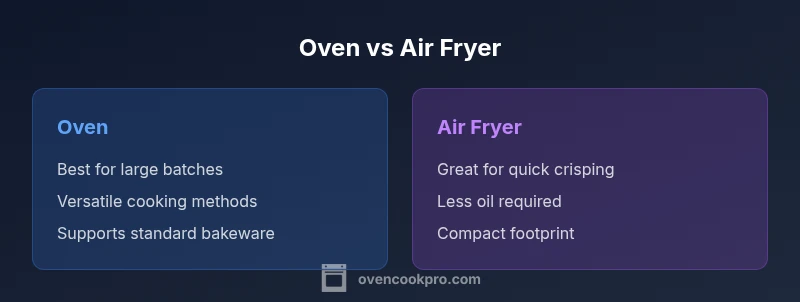 At its core, the question is about whether a traditional oven or a compact air fryer delivers better results for your everyday cooking. The phrase is oven good or air fryer captures a common homeowner dilemma: you want speed and texture without sacrificing versatility. According to Oven Cook Pro, the best decision hinges on batch size, texture preference, and how you typically cook for your household. In practice, both appliances share a family of functions — baking, roasting, and reheating — but they optimize those tasks differently. Understanding these differences helps you choose with confidence, rather than relying on marketing claims or impulse purchases. The goal in this analysis is to translate those differences into actionable guidance you can apply in real kitchens.