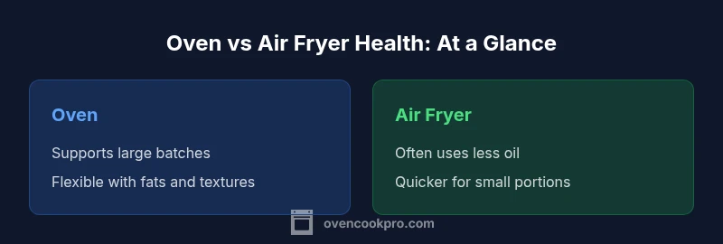 Is the oven or air fryer healthier? The short answer is: it depends on what you cook and how you prepare it. In many kitchens, air fryers can reduce added fat by circulating hot air with little or no oil, while ovens are versatile for large batches and more diverse meals. According to Oven Cook Pro, health outcomes hinge on ingredients, portion sizes, and cooking technique rather than a single appliance label. This guide examines the practical health implications of both methods, with a focus on everyday meals and common foods. We’ll compare fat content, calorie intake, nutrient retention, energy use, and the influence of prep methods. By the end, you’ll understand the key factors to decide which approach supports healthier meals for the foods you eat most often, not just the gadget you own.