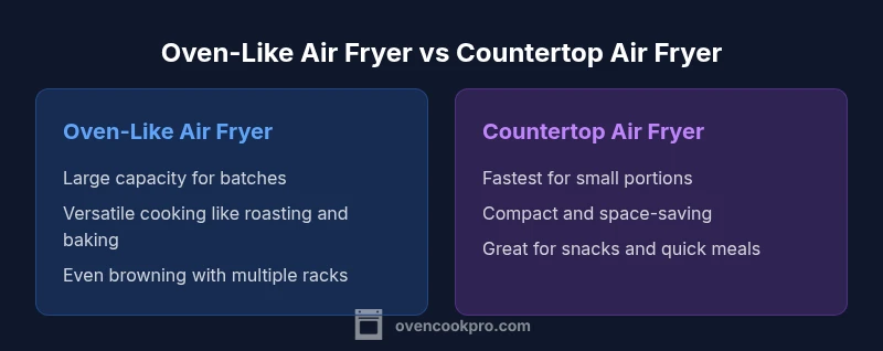 An oven like air fryer combines air-frying crispness with the capacity of a regular oven. It is often slower than a dedicated air fryer but offers more versatile space for larger meals. Our Oven Cook Pro analysis shows it is ideal for households needing volume and flexible workflows, while a true countertop air fryer remains fastest for small batches.