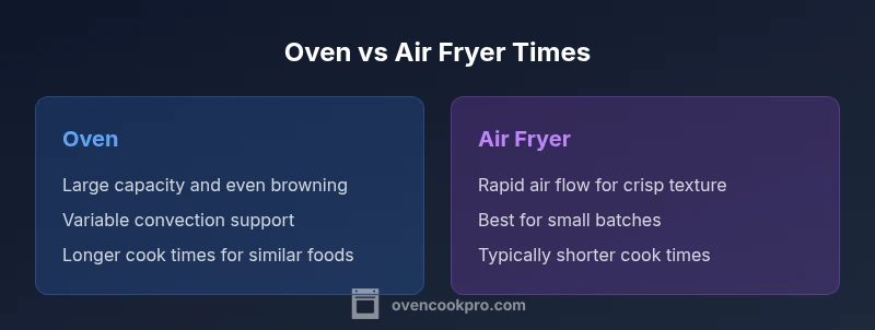 For home cooks, timing is the invisible ingredient that determines a dish's success. When you compare an oven and an air fryer, several factors tilt the clock: heat transfer method, batch size, preheating, and the goal for texture. The air fryer's compact chamber and rapid air movement can shave minutes off small portions and crispy items, while a traditional oven shines with large roasts, casseroles, and desserts where even browning matters. The goal of this section is to establish the framework Oven Cook Pro uses to evaluate timing across recipes, so you can adapt to your kitchen setup and schedule without guessing. Throughout this guide we use the keyword oven vs air fryer times to anchor our comparisons and help you plan for real-life cooking windows.