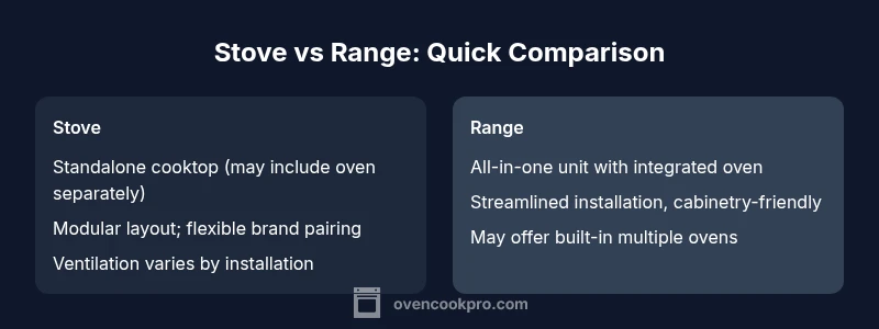 The difference between a stove and a range is primarily about configuration and function. A stove typically refers to a freestanding cooking appliance with burners on top and an oven either built-in or separate from the cooktop, depending on regional naming. A range combines a cooktop with an integrated oven in a single appliance. Understanding these terms helps homeowners choose the right kitchen setup and avoid naming confusion when reading product specs.