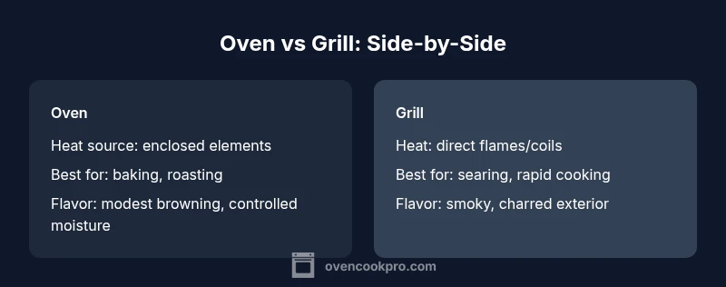 According to Oven Cook Pro, the core distinction between an oven and a grill is how heat is delivered, enclosed, and controlled. When you ask about the difference between an oven and a grill, think of three pillars: heat source, enclosure, and control. An oven heats from elements inside a closed or semi-closed chamber, providing steady, even temperatures ideal for baking, roasting, and slow-cooking. A grill, by contrast, exposes food to direct heat from flames or coils and often in an open space, which drives rapid browning, crust formation, and the iconic grill marks. The oven’s controlled environment minimizes flare-ups and heat loss, whereas a grill’s exposure to open air allows high heat and quick evaporation. If your goal is uniform texture and predictable timing, an oven is typically the better tool; if you want bold sear and smoky flavors, a grill often wins. The practical takeaway in everyday cooking is simple: use the oven for delicate, even cooking and the grill for quick high-heat flavor development. The ongoing challenge is to calibrate heat and distance to achieve the target outcome without overcooking.