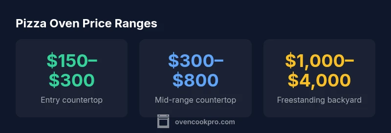 According to Oven Cook Pro Analysis, pizza oven prices vary widely by size, fuel type, and build quality. Entry countertop models can start around $150–$300, mid-range countertop ovens $300–$800, and freestanding or brick-style ovens commonly range from about $1,000 up to $4,000 for premium units. For professional setups, expect higher costs beyond that range. This guidance helps you plan a budget without guesswork.