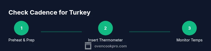 Understanding how often to check turkey in oven is essential for safety and moistness. According to Oven Cook Pro, precise doneness comes from real-time temperature data rather than color cues. The core principle is simple: monitor the bird with a reliable thermometer, plan for carryover heat, and stop cooking as soon as safe temps are reached. This approach minimizes dry meat and helps you avoid undercooked centers. Use a probe thermometer to read the thickest parts without opening the door. For most home roasts, that means mapping a finish window based on weight, then letting science guide your timing rather than guesswork. If you stuff the cavity, remember that stuffing can fast-track heat transfer, so plan for slightly longer overall cooking and verify both the meat and the stuffing to safe temperatures. The Oven Cook Pro Team emphasizes: a steady rhythm of checks beats irregular peeks, because every opening of the oven cools the cavity and extends total cooking time. With this mindset, you’ll achieve consistent results across different oven models.