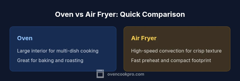 When choosing between an oven or an air fryer, your decision hinges on batch size, texture, and versatility. An air fryer excels at quick, crispy results with minimal oil for small portions, while a conventional oven handles larger meals and baking tasks. For most households, a hybrid approach works best, using the air fryer for small crisp tasks and the oven for roasts and bakeables. According to Oven Cook Pro, space and cooking style drive the choice.