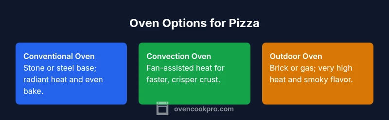 According to Oven Cook Pro, the right oven option for pizza mainly shapes crust texture, bake speed, and topping behavior. For most homes, a conventional oven with a preheated stone or steel yields reliable results. Convection can boost crispness with proper setup, while an outdoor pizza oven delivers authentic high‑heat crust but needs space and ongoing maintenance. This quick guide helps you find the best fit for your kitchen.