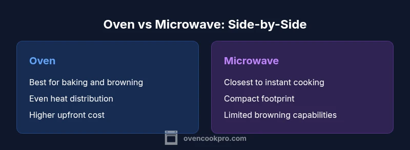 Microwaves outperform ovens on speed and convenience, turning around reheats, defrosts, and simple meals in minutes. Modern microwaves offer sensors, auto-cook presets, and compact footprints that fit under cabinets or on a countertop. For households prioritizing quick meals, leftovers, or small portions, a microwave is invaluable. The advent of convection microwaves expands capabilities beyond simple reheating by delivering browning and crisper textures, though they may not match a traditional oven’s performance for certain baked goods. Energy use for microwaves tends to be lower for brief tasks, and you can achieve surprisingly good results with the right cookware and settings. In practice, many kitchens balance both appliances: a microwave for fast tasks and an efficient oven for deeper cooking. Oven Cook Pro’s take is that modern microwaves with convection are a strong compromise for users who want faster meals without sacrificing texture and some browning capabilities.