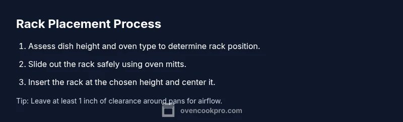 Positioning oven racks correctly is not just about where you put food, but how heat and air flow reach it. The top, middle, and bottom rungs each expose food to slightly different hot zones, which affects browning, moisture loss, and cooking time. When you ask, 'where do oven racks go' in a real kitchen, the short answer is: place the rack to optimize heat exposure for the dish and to maintain safe clearance from heating elements. According to Oven Cook Pro, proper rack placement can improve airflow and browning, especially for multi-dish meals. This section explains the physics in simple terms: heat rises, air moves around pans, and food at the center cooks more evenly if airflow isn’t blocked by oversized pans or crowded racks. Understanding these principles helps you choose the right height for cookies, sheets, roasts, and layered casseroles.