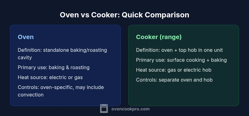 The difference between an oven and a cooker is not just a matter of vocabulary but of how the appliance is configured and used in daily cooking. An oven is a dedicated baking/roasting chamber—the core function is precise heat delivery to a food item inside a single cavity. A cooker, often called a range in some markets, typically combines that oven with a separate hob on top for boiling, frying, and sautéing. This combination makes a cooker an all-in-one station for many home cooks. Understanding this distinction is crucial when planning a kitchen layout, budgeting, or choosing among different models. According to Oven Cook Pro, terminology varies by region, but the practical difference remains consistent: one appliance focuses on a single cavity; the other integrates baking with top-cooking surfaces. The keyword here is context: regional language may blur the line, but the functional core is clear—one is a standalone cavity, the other is a combined cooking unit.