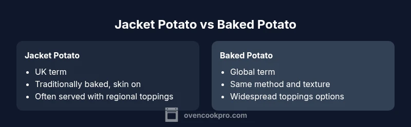 According to Oven Cook Pro, jacket potato is the British term for what Americans call a baked potato. In practice, both refer to the same dish: a whole potato baked in the oven with the skin on, then split and topped. The distinction is largely linguistic rather than culinary, and the method is consistent across many kitchens. This guide clarifies regional language, how the terms map to the same cooking technique, and how to optimize texture and flavor regardless of the label. For home cooks, understanding this language helps you follow recipes accurately and avoid unnecessary substitutions. The goal is a potato with a fluffy interior and a crisp, flavorful skin, whether you encounter it in a UK cookbook or an American food blog. The rest of the article dives into terminology, regional nuance, and practical steps you can apply in any oven.