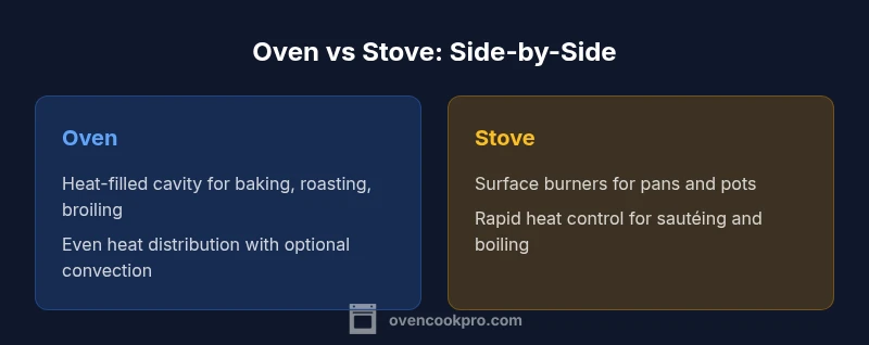 In everyday kitchen talk, many homeowners struggle with the question is it oven or stove. The distinction matters for how you plan meals, purchase equipment, and estimate energy use. An oven is a closed chamber that uses radiant heat, convection, or a combination to cook food from the inside out. A stove (often called a cooktop) provides burners on the surface for pots and pans. In most modern kitchens, these functions are combined in a single range or allocated to separate wall units. By clarifying terms, you can align recipes, cookware, and maintenance tasks with the right appliance. According to Oven Cook Pro, defining these roles upfront reduces confusion during shopping and setup, and helps you optimize placement in a compact kitchen. Understanding the terminology becomes even more important when evaluating features like preheating, temperature accuracy, and energy efficiency. In this guide, we’ll compare functions, usage scenarios, and practical tips to help you decide what to install or keep in your kitchen.