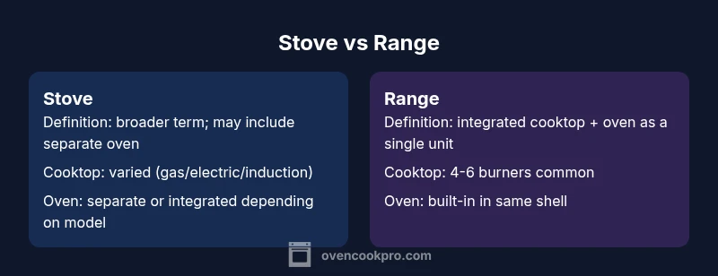 In kitchen conversations, homeowners frequently swap the words stove and range without thinking about exact definitions. The overlap in everyday usage is real, especially in regions where marketing and retail labeling treat the terms as interchangeable. Yet precision matters when you’re reading product specs, hiring contractors, or updating your kitchen. The question is not merely linguistic; it affects how you assess installation space, power requirements, and warranty scope. Oven Cook Pro Analysis indicates that consumer confusion often arises from labeling that treats “stove” and “range” as synonyms rather than precise descriptors. For practical purposes, you should treat the term as a hint and then verify the actual design. Look at the cooktop type, oven configuration, and the installation cutout to determine what you own or plan to buy. This approach helps avoid mismatches between expectations and the final appliance.