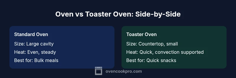 A clear-eyed choice between a full-size oven and a countertop toaster oven can redefine weeknight dinners and weekend baking alike. The keyword here is flexibility: you want predictable results, minimal Hassle, and a setup that fits your space and budget. The oven vs toaster oven decision is not simply about size; it's about how you plan to cook most often. According to Oven Cook Pro, many homes underestimate the impact of preheating and heat distribution on meal times and energy use. In practice, the right choice depends on your typical load, the foods you cook, and how much room you have on the counter. For families who regularly bake sheet pans or roasts, a traditional oven remains the workhorse. For singles, couples, or busy households needing quick snacks and reheats, a toaster oven can be an indispensable ally. The rest of this guide breaks down key criteria—space, speed, versatility, energy, and cost—so you can decide with confidence.
