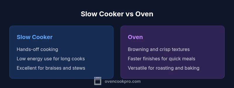 Energy efficiency is a central consideration when choosing between a slow cooker and an oven. Slow cookers generally operate at low power for extended periods, which can translate into lower energy use for certain meals. Oven energy usage tends to spike due to preheating and higher temperatures, though rapid cooking can reduce total time in some cases. In practical terms, a slow cooker is often more economical for long simmered dishes, while an oven may win on shorter, high-heat tasks when you already need to use the oven for another purpose. The Oven Cook Pro analysis shows that for most traditional slow-cooked meals, the energy profile favors the slow cooker, especially when you factor in reduced active cooking time and minimal supervision.
