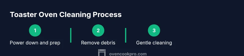 A safe, repeatable workflow minimizes risk. Start by unplugging the unit and removing the crumb tray and racks. Wipe away loose crumbs, then apply a mild cleaning solution to interior surfaces with a damp cloth. Avoid soaking the control panel or heating elements. Rinse with a fresh cloth to remove all soap residue and dry thoroughly. Reassemble, plug in, and run a short empty bake to ensure there is no moisture or odor left. This workflow keeps your appliance ready for daily use while preserving safety and performance.