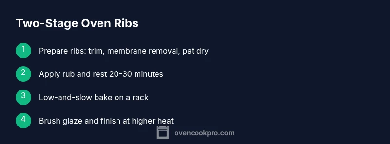 Baking pork ribs in the oven is a dependable way to achieve tender meat and a flavorful crust without propane grills or smokers. The controlled environment lets you manage temperature, humidity, and timing with precision, which is especially helpful for beginners. According to Oven Cook Pro, mastering the oven starts with planning and prep, not luck. When you bake ribs in the oven, you can replicate restaurant-like tenderness at a fraction of the cost and cleanup. The key is a two-stage approach: a long, gentle bake to break down connective tissue, followed by a short, hotter phase to set the glaze and crust. This method also minimizes flare-ups and smoke, making it a practical choice for apartment kitchens, weeknights, or any situation where outdoor cooking isn’t feasible. Throughout this guide, you’ll see how seasonings, technique, and timing come together to deliver consistently delicious results.