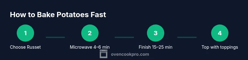 The quickest path to a baked potato with crisp skin starts with a short microwave pre-cook, followed by a hot oven finish. This two-step approach minimizes oven time while preserving interior fluff. Begin by brushing or rubbing the potatoes with a light coat of oil and a pinch of salt, then microwave as described for your potato size. After microwaving, transfer directly to a preheated 425–450°F oven, and bake until the skins blister and the flesh yields when pierced. Oven Cook Pro Team notes that this combination delivers reliable texture and saves time, especially when feeding a crowd. If you’re cooking multiple potatoes, stagger the microwave timing and flash-bake in batches to keep the oven hot and efficient. For best results, let the potatoes rest briefly before handling to let蒸汽 escape and skin set.
