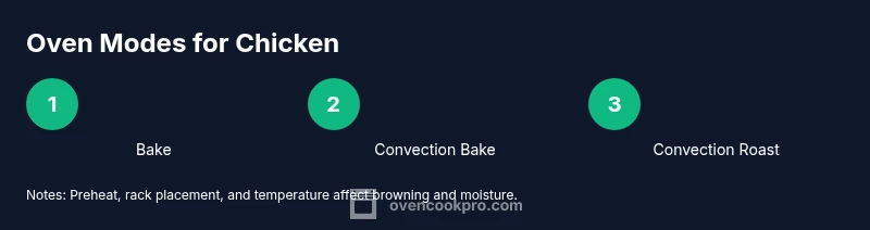 Cooking chicken successfully starts with how heat is delivered to the meat. Different oven modes create different heat patterns, browning, and moisture retention. According to Oven Cook Pro, the right mode can significantly influence tenderness and crust, especially for bone-in pieces or a whole bird. In this section we unpack the major modes you’ll encounter at home and how they affect texture, time, and safety. You’ll learn when radiative heat from the top coil matters, how fan-assisted heating changes airflow, and why rack placement matters for even cooking. The goal is to equip you with a mental map: for juicy interiors, choose modes that balance steady heat with airflow; for crispy skin, prioritize modes that promote surface browning without overcooking the inside. A quick note on safety: always preheat with a thermometer ready and avoid opening the door too often, which can drop oven temperature and extend cook time.