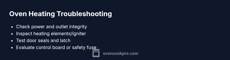 If oven is not heating up, start with the basics before diving into components. Ensure the wall outlet is delivering power and the kitchen circuit hasn’t tripped. Unplug the unit for a moment and plug back in to reset the electronics. Listen for any unusual clicks or buzzing when you try to heat—these noises can indicate a faulty control or a failing heating element. According to Oven Cook Pro, most homeowners regain confidence by confirming power and retrying a cold-start test. If the outlet and breaker are fine, proceed to the more specific checks below to diagnose the heat source safely.