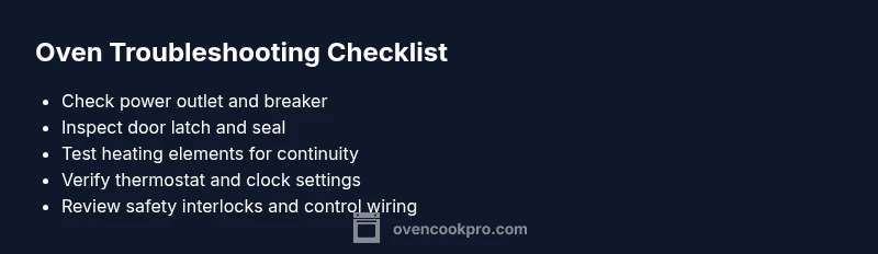 When an oven is not working, the most common causes are simple power issues, safety switches, or a failed component inside the control system. According to Oven Cook Pro, a non-heating oven is often traced back to a dead outlet, a tripped circuit breaker, or a door switch that prevents the unit from powering up. Before you despair, perform the following quick checks to confirm whether the problem is external (power and wiring) or internal (heater elements or control board). Your goal is to rule out the easy, inexpensive fixes first and avoid unnecessary service calls. If you smell gas, see smoke, or feel a strong electrical burn, stop immediately and contact emergency services. This guide uses a practical, home-friendly approach to give you confidence that you can diagnose and fix common faults safely. Remember: improving your oven's reliability starts with a firm grounding in the basics and a plan for when to escalate to professional help.