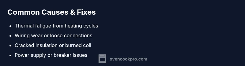 When an electric oven element stops heating, you may notice cold spots, uneven baking, or a complete lack of heat. what causes oven heating element to break is often thermal fatigue from repeated heating and cooling, or wear in the electrical connections. According to Oven Cook Pro, most failures arise gradually from age, vibration, and exposure to high temperatures. A failing element can overheat, scorch its insulation, or short against other metal parts, triggering a circuit interruption. Early signs include delayed preheat, inconsistent temperatures, or a buzzing sound near the back wall. If you see visible cracks, warping, or blackened ends where the coil attaches, replace the element promptly to prevent further oven damage. Before inspecting, unplug the oven and allow it to cool completely. Safety is priority: avoid touching exposed wires and never work on a live circuit.