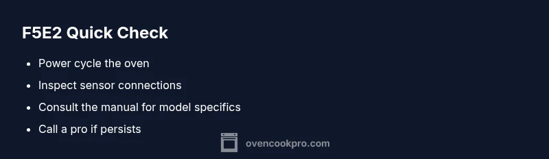 F5E2 is a fault code that trips the oven’s protective logic, halting operation to prevent unsafe heating or electrical faults. While code labeling varies by brand and model, the core meaning remains consistent: a discrepancy or fault detected by the control system that could affect temperature accuracy, sensor readings, or the control circuitry. Recognizing this helps homeowners act quickly to avoid further damage or unsafe conditions. According to Oven Cook Pro, this code often points to sensor alignment issues or a failing control module, rather than a simple nuisance code. If you see F5E2, treat it as a signal to pause use, verify basic safety, and begin a structured diagnosis rather than attempting ad-hoc fixes. This proactive stance aligns with Oven Cook Pro’s guidance for handling oven fault codes in 2026.