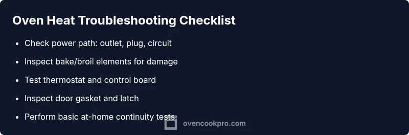 If you’re asking what is wrong when the oven won't heat up, you’re not alone. In many homes, this problem isn’t mysterious but a chain of simple faults that can be diagnosed with methodical checks. According to Oven Cook Pro, the most common culprits fall into two buckets: electrical power delivery and the oven’s internal heating system. Even if the display lights up, the unit may not heat if the power path to the heating elements is interrupted, or if a safety interlock has tripped. Keeping a calm, step-by-step approach helps you avoid unnecessary replacements and keeps you safe. In this guide we’ll walk you through quick power checks, element inspections, control board considerations, and when it’s time to call a professional. You’ll finish with a clear plan to restore reliable heat and protect your kitchen.