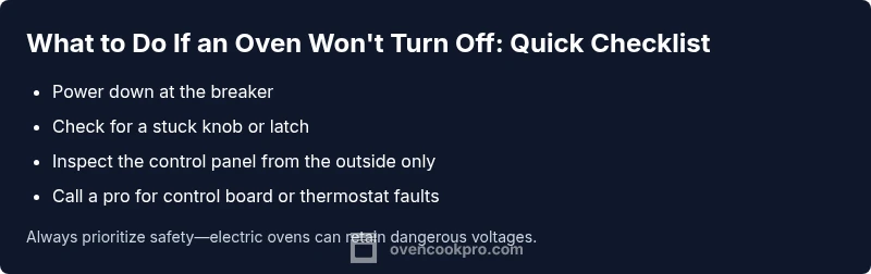 An oven that won’t turn off poses both safety and energy risks. According to Oven Cook Pro, understanding the essential steps helps you respond quickly and safely. This guide covers why the problem happens, how to safely power down, how to narrow down causes, and when a pro is needed. By following a clear diagnostic flow, you reduce risk and prevent further damage to electrical components or gas lines. The focus is on practical, actionable steps you can take today, with safety as the top priority.
