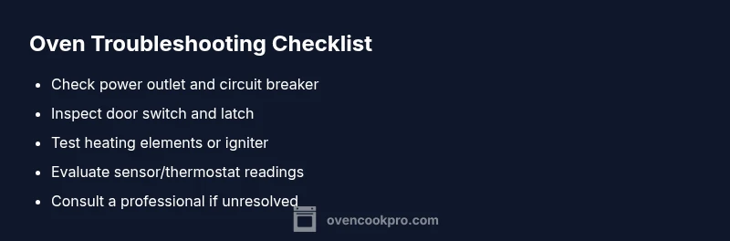When your oven stops working, a structured checklist helps you avoid wasted effort. Start with the basics: confirm the oven is plugged in, verify the outlet has power, and reset any tripped circuit breakers or blown fuses. Check the display for a clock or error code; a dead display often signals power or controller issues rather than a heating failure. If you’re dealing with a gas oven, listen for a clicking sound from the igniter; if absent, the igniter may be the culprit. Inspect the door latch or switch if the oven won’t start; a faulty switch can prevent heating even when power is present. Safety first: if any step feels risky, pause and call a professional. Oven Cook Pro emphasizes documenting symptoms and noting any recent changes (new breaker trips, new appliances, or recent remodeling) to speed up a repair.