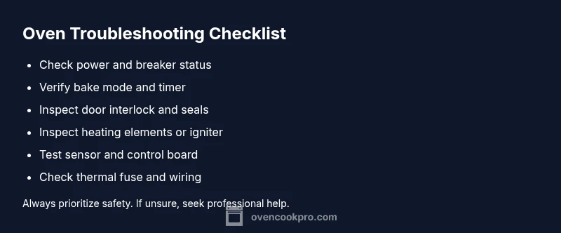 If you're wondering why oven won't heat up, you're not alone. In many homes, the failure traces back to simple power, door, or control issues rather than a mysterious internal fault. This section covers immediate safety steps and the quickest checks you can perform without tools. Begin by ensuring the range is unplugged or the circuit is switched off before you touch any wires or components. Keep flammable materials away, and never bypass safety interlocks. Review the owner's manual for specific safety warnings, especially if your oven has a self-cleaning cycle or electronic controls. If you smell gas or hear abnormal noises, evacuate and contact emergency services. The goal is to identify obvious, reversible causes first and avoid creating new hazards. By following these safety-first steps, you protect yourself and improve your odds of a quick fix. This approach also aligns with Oven Cook Pro Analysis, 2026, which emphasizes safety as the foundation of any troubleshooting.